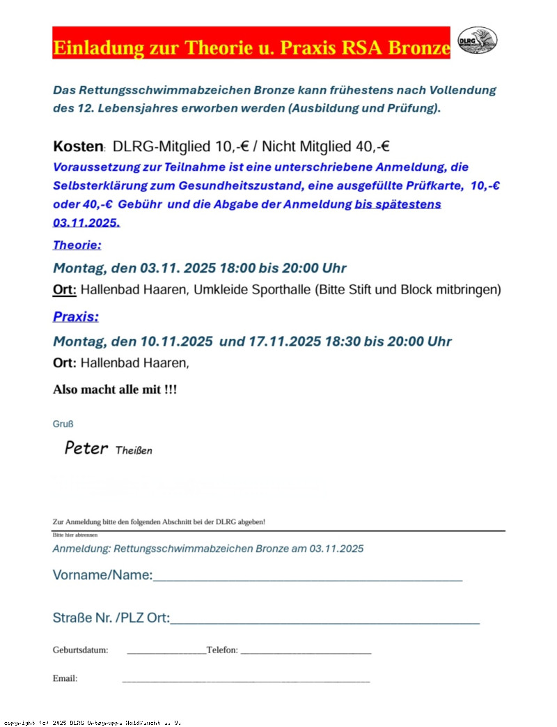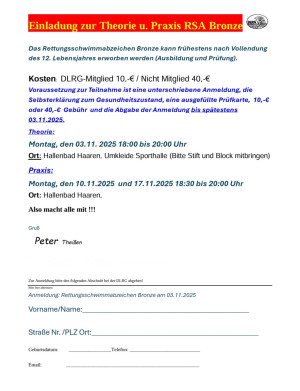 Das Rettungsschwimmabzeichen Bronze kann in einem Kurs am 03.11.2025  mit Folgetermin 10.11.2025 bei der DLRG Waldfeucht erworben werden.